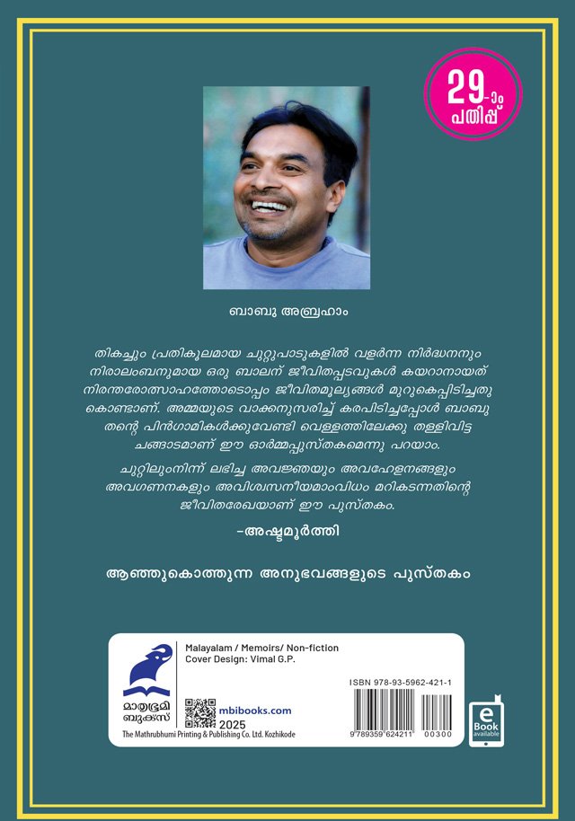 തികച്ചും പ്രതികൂലമായ ചുറ്റുപാടുകളില് വളര്ന്ന നിര്ദ്ധനനും നിരാലംബനുമായ ഒരു ബാലന് ജീവിതപ്പടവുകള് കയറാനായത് നിരന്തരോത്സാഹത്തോടൊപ്പം ജീവിതമൂല്യങ്ങള് മുറുകെപ്പിടിച്ചതുകൊണ്ടാണ്. അമ്മയുടെ വാക്കനുസരിച്ച് കരപിടിച്ചപ്പോള് ബാബു തന്റെ പിന്ഗാമികള്ക്കുവേണ്ടി വെള്ളത്തിലേക്കു തള്ളിവിട്ട ചങ്ങാടമാണ് ഈ ഓര്മ്മപ്പുസ്തകമെന്നു പറയാം. ചുറ്റിലും നിന്ന് ലഭിച്ച അവജ്ഞയും അവഹേളനങ്ങളും അവഗണനകളും അവിശ്വസനീയമാംവിധം മറികടന്നതിന്റെ ജീവിതരേഖയാണ് ഈ പുസ്തകം.